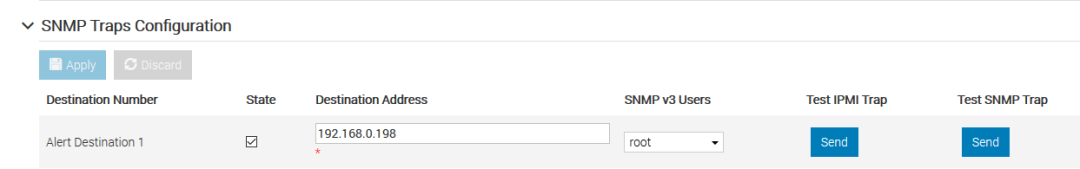在SNMP Traps设置中,勾选State来启用警报目标可以填写IPv4地址、IPv6地址或完全限定域名(FQDN),目前最多可以指定八个目标地址;