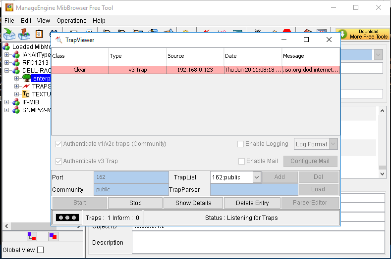 而为了接收SNMP Agent发送的通知,管理端需要启用Trap接收机制——通常使用的是UDP162端口,收到Agent发送的信息时,接收端的控制台会显示事件出来,并带有描述事件的相关表述。