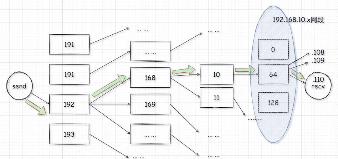 同理,IP地址也具备此功能,通过IP地址的网络位可以确定某个主机所在网络的位置,从而明确一条数据传送的路径。例如目的地址为192.168.10.110/26,则该地址所在的网络为192.168.10.64。