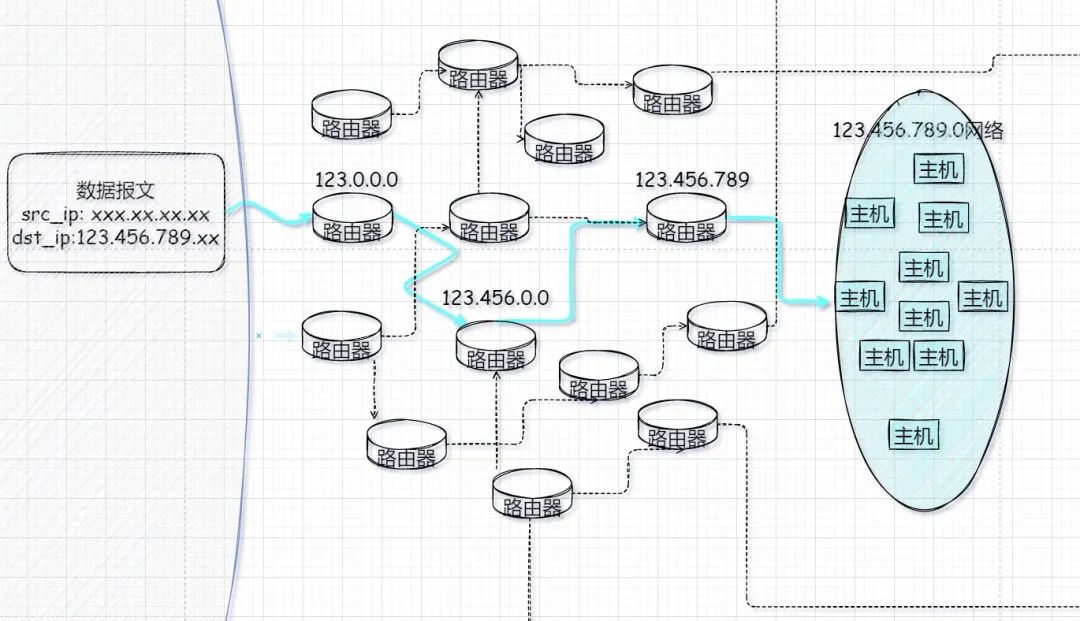 2. 各个网路之间通行需要使用到IP地址,主要是为了定位目的地址所在的位置,通过IP的分段机制推演出从源IP到目的IP的一条路径,而后数据包通过这条路径将数据送达。