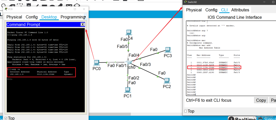 这样,当pc0(192.168.1)ping pc3(192.168.4)时,交换机查自己的MAC表,发现自己的以太网fa0/4接口的出口对应的就是目的主机MAC地址,则交换机将自己该数据报文转发从fa0/4接口转发出去。