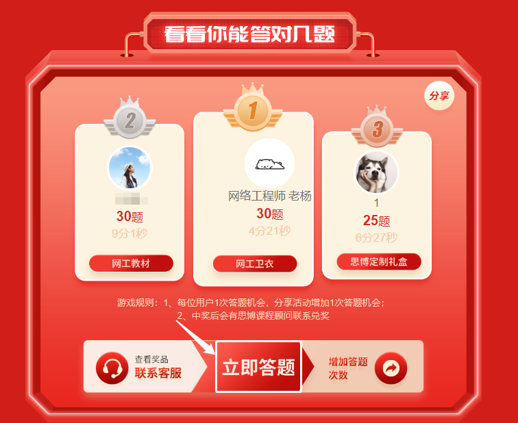 填写必要的登录信息后,会随机生成一个头像。页面下拉,找到图片中的这个按钮,选“立即答题”,即可参与答题。