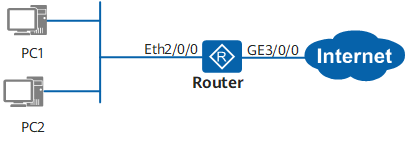 如图所示,AR和Internet之间的连线只有一条,GE3/0/0是连接Internet的接口,也叫作公网口,Eth2/0/0是连接私网的接口,也叫作私网口。