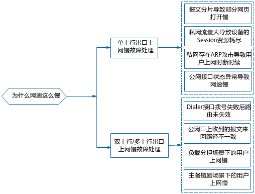为了帮助用户解决在通过AR上网时遇到的上网慢问题,这里从多个现网真实案例中,总结出两大常见上网慢故障场景:单上行出口上网慢和双上行/多上行出口上网慢。
