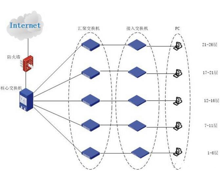 2. 汇聚层由5台汇聚交换机组成,配备1000Mbps光纤模块,分别放在1层、7层、12层、17层和21层。