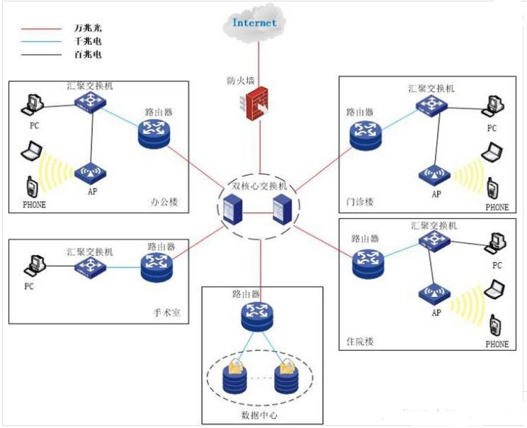 1. 核心层核选用多层路由交换机作为核心交换机,连接服务器进行数据管理,通过防火墙连接到互联网。