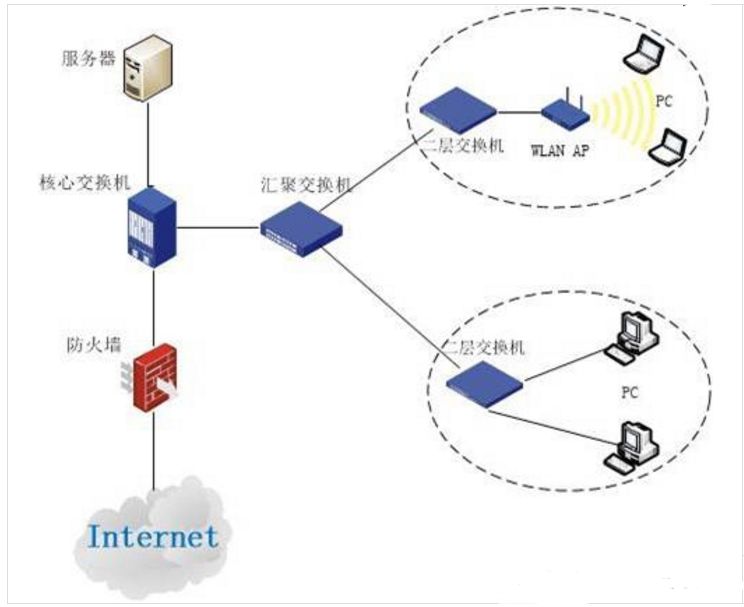 3. 接入层选用普通的二层交换机,提供100Mbps到桌面,可以通过WLAN/AP连接PC或者直连PC。