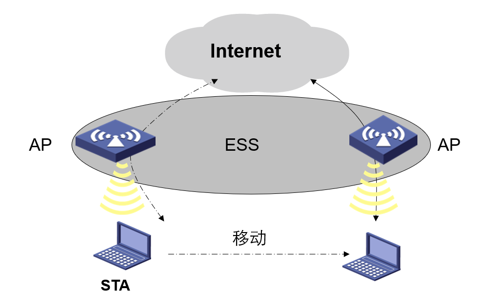 从应用上讲,漫游是WLAN网络提供给终端在ESS区域内不受限制的移动,并保证业务不中断、终端IP地址不改变的一种服务。