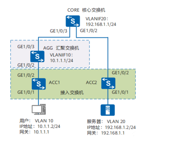 为了安全及便于管理,企业为服务器专门划分VLAN,用户属于VLAN 10,服务器属于VLAN 20。用户与服务器间跨接入、汇聚和核心交换机,其中接入是二层交换机,汇聚、核心是三层交换机。由于业务需要现要求用户与服务器间可以互通。