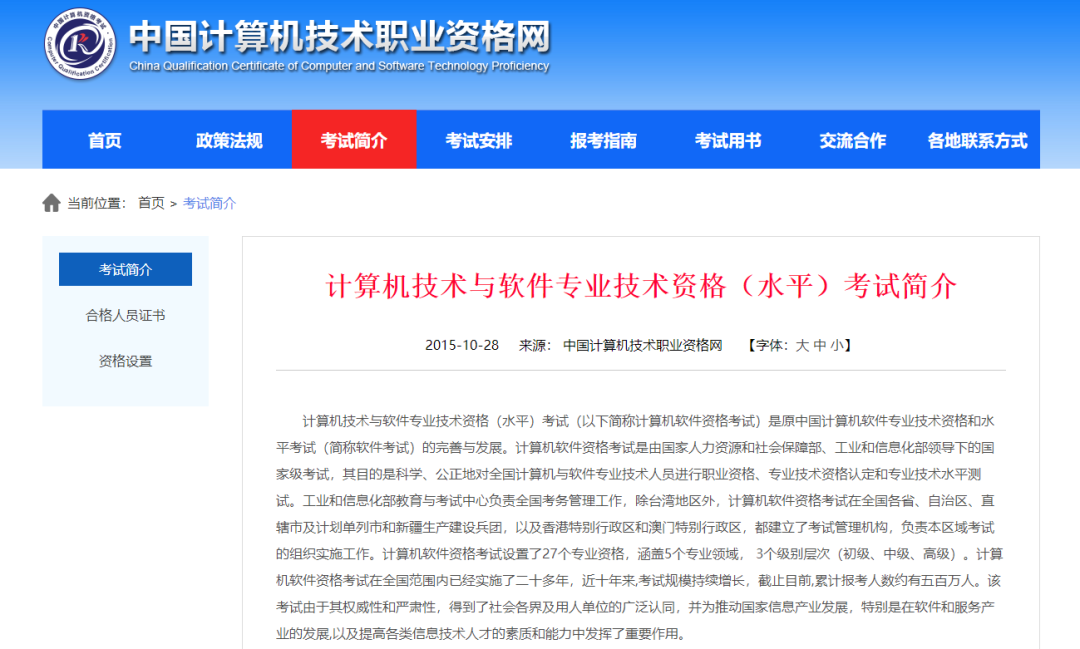 该考试是由国家人力资源和社会保障部、工业和信息化部领导下的国家级考试,其目的是科学、公正地对全国计算机与软件专业技术人员进行职业资格、专业技术资格认定和专业技术水平测试。截止目前,累计报考人数约有五百万人。