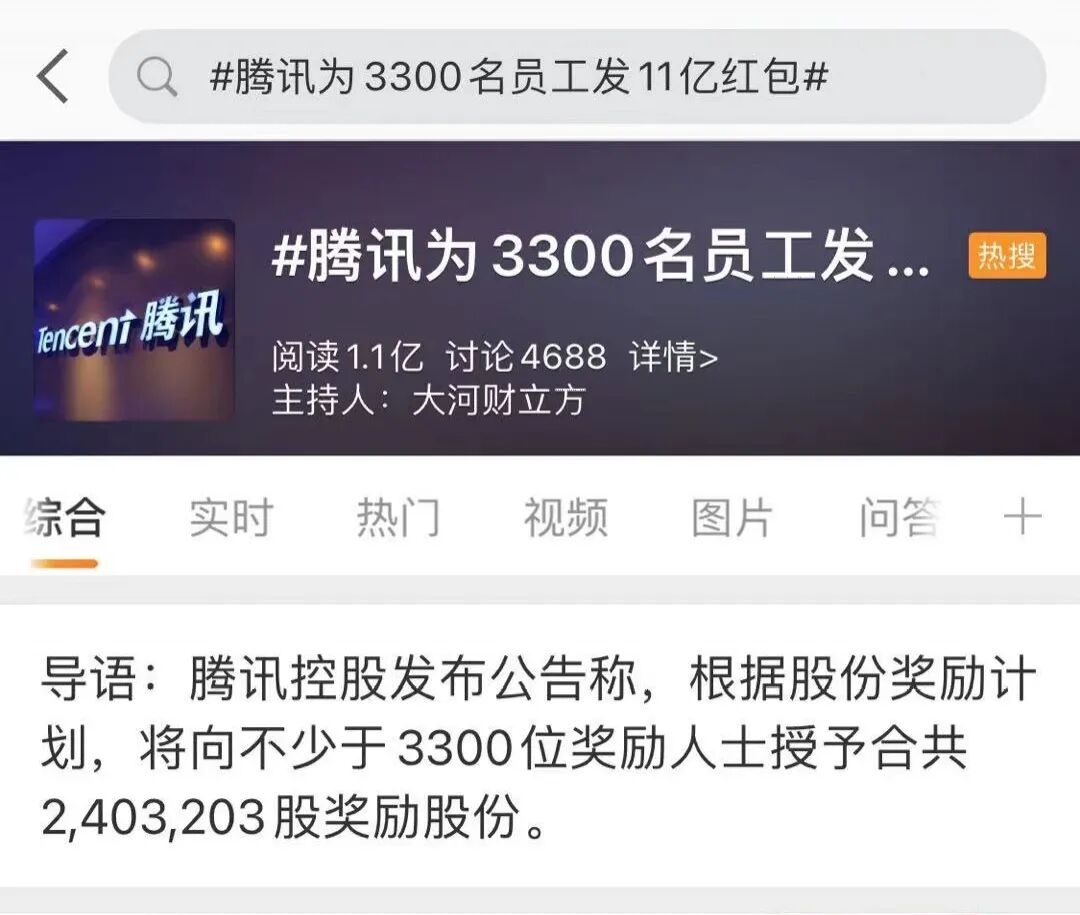 起因是,为了嘉许奖励部分员工作出的贡献,并吸引及挽留本集团持续经营及发展所需的人才,腾讯决定向3300位员工授予合共2,403,203股奖励股份。