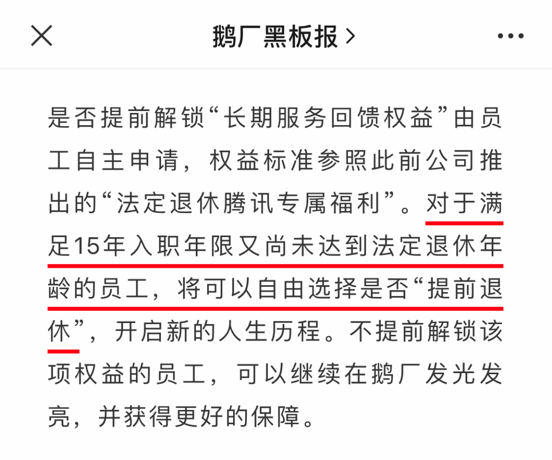 如果你满足15年腾讯入职年限,但是又没达到法定退休年龄,你可以选择在腾讯直接“提前退休”。
