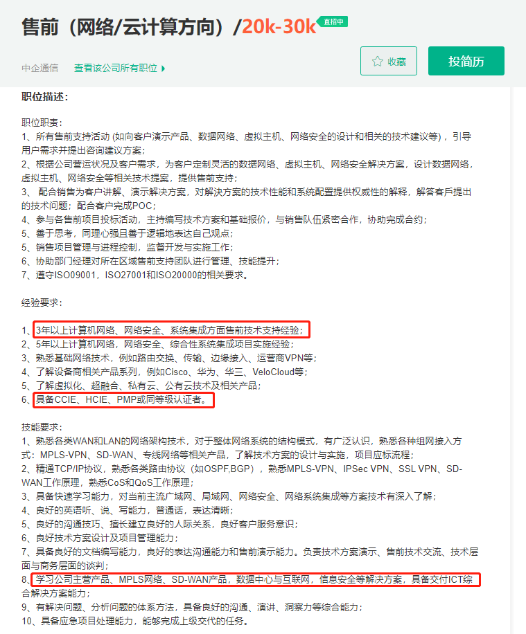 而一个月薪30k的售前工程师,他的工作职责和岗位要求,可以看着一张图: