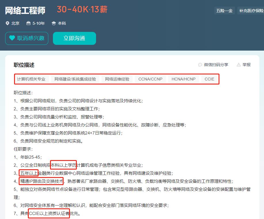 而月薪10k的网络工程师对认证证书的要求并没有把控得这么严格,只需要NP或同级别以上的证书就行。