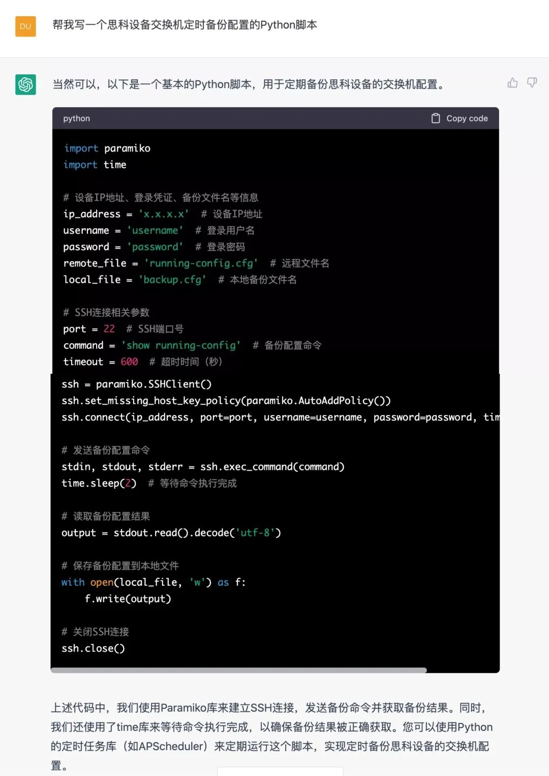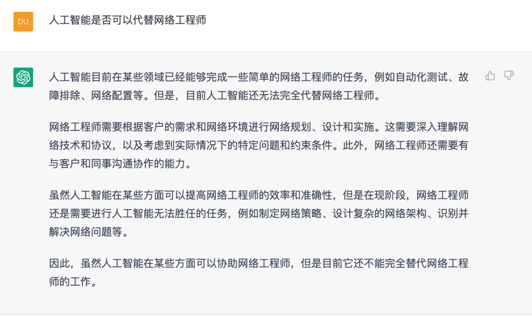 甚至还看到有些网工朋友让ChatGPT写组网方案,技术解析,甚至是项目计划书,啥都交给它干,自己检查就好。