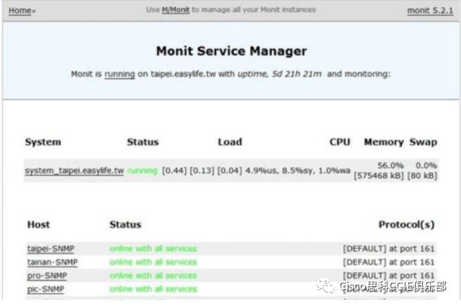 当然,Monit 还可以用来监控一般的系统资源, 比如 CPU使用,内存,以及负载均值 Load Acerage。