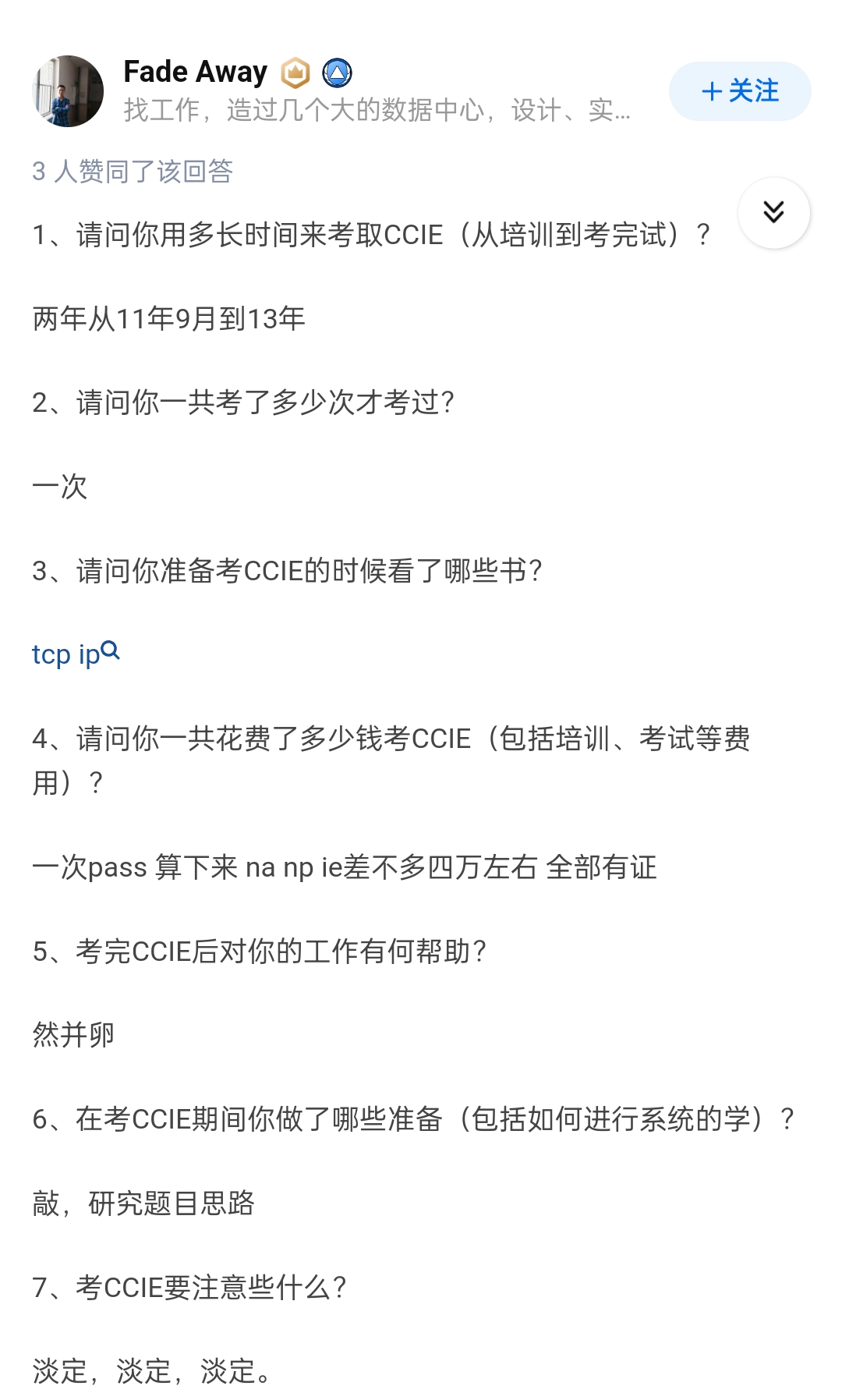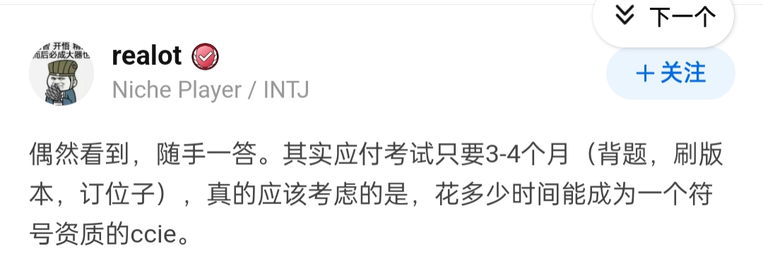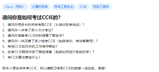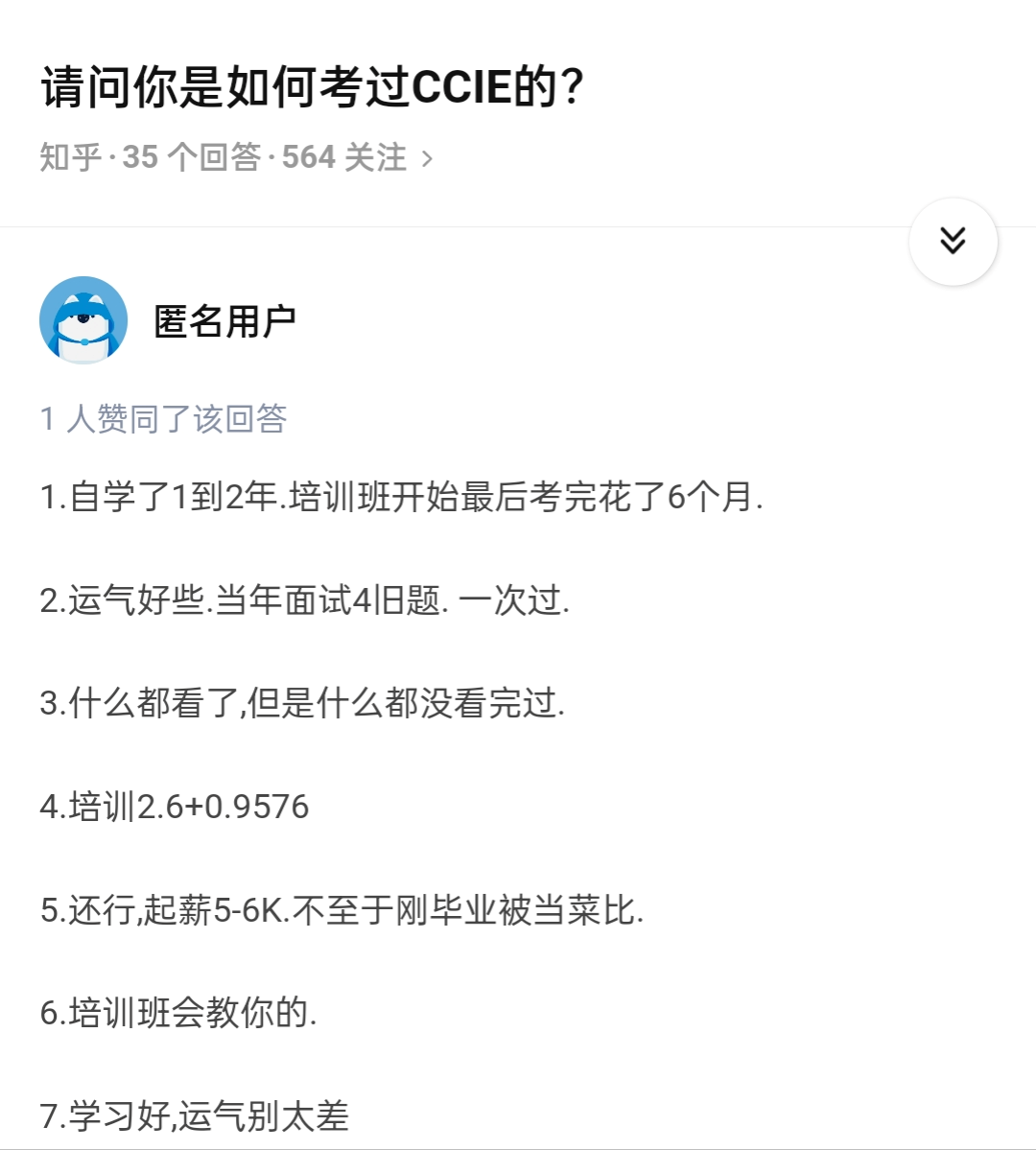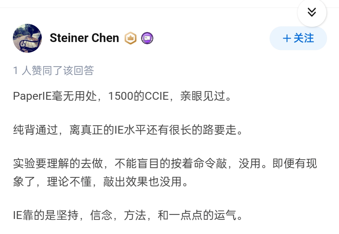 顺便分享一下我的回答吧,毕竟我也是CCIE出身的,加一个我的回答,或许也能给你一点启发。