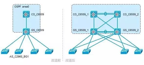 网络结构见“改造前”,可以看得出,网络结构比较简单,而且存在单一设备、单一链路的缺陷。