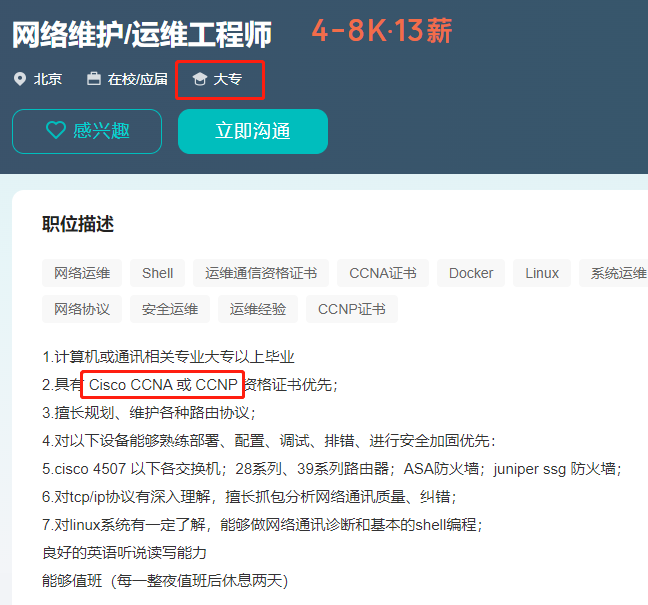 有CCNP及以上的证书,可以拿到4-8K·13薪的工作。