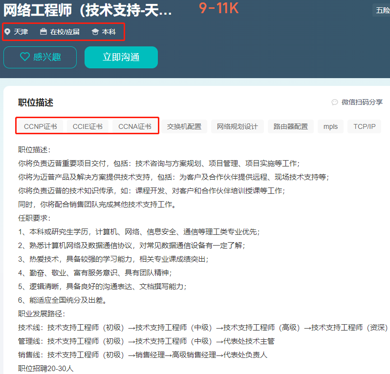 有CCNP及以上的证书,可以拿到13-17K·14薪的工作。