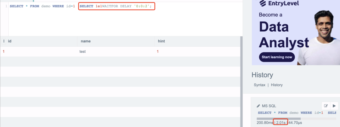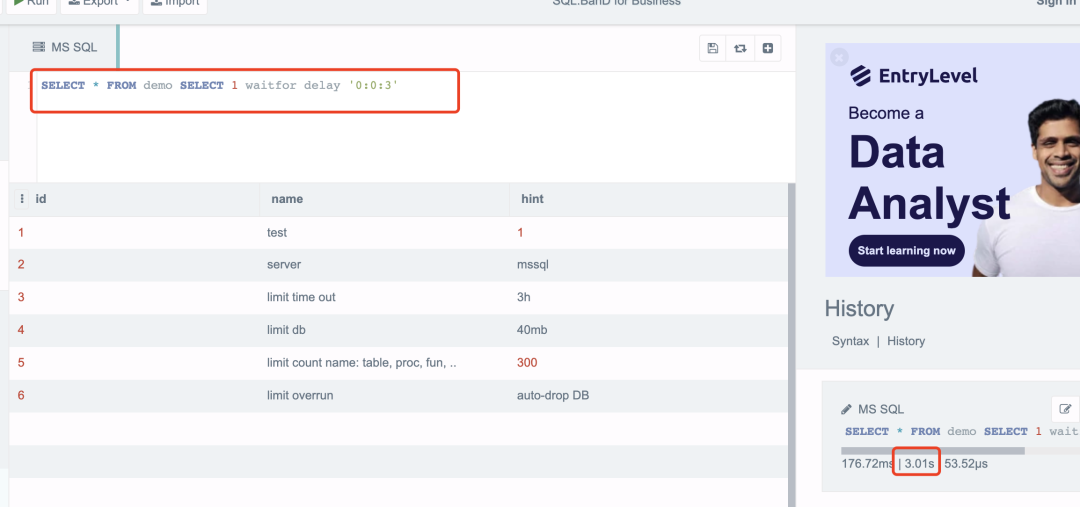 我尝试;waitfor delay '0:0:3';直接报错了,那么大概率可能不支持堆叠查询。