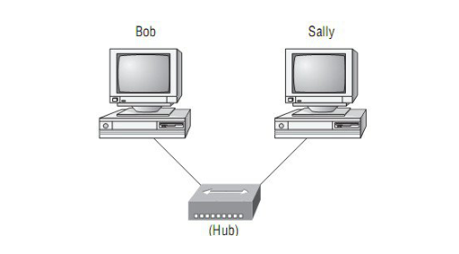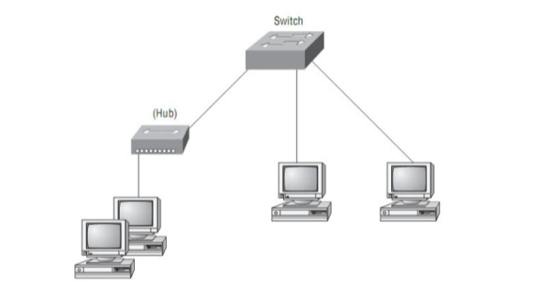 看图,这是一个使用集线器连接的基本LAN网络。实际上,它只有一个冲突域和一个广播域。
