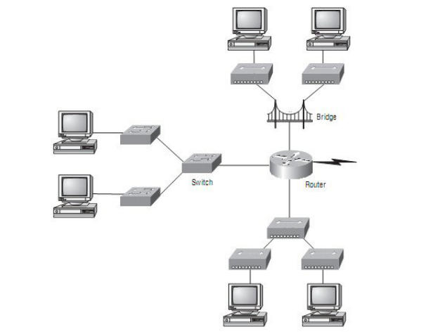 下图是一个使用了所有这些网络互联设备的网络。请记住,使用路由器时,不仅可使每个LAN接口都属于一个独立的广播域,它还将分割冲突域。