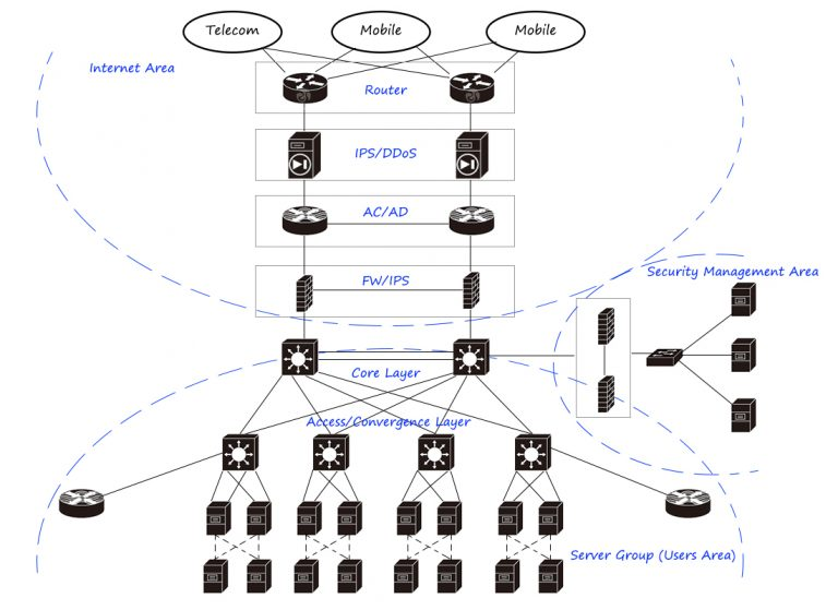 Internet出口区域使用路由器执行BGP和地址反转,使用IPS / anti-DDoS设备进行大流量泛洪攻击,使用流量控制执行出口负载,并使用防火墙进行安全隔离。安全管理区通过防火墙安全访问,通过审计、日志、入侵检测、网络管理等产品对整个网络进行管理。