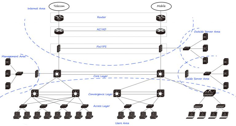 最常见的园区网架构,如大中型企业网络/校园网络,采用接入汇聚核三层架构和双核组网。根据网络需求,分为用户区、内部服务区、外部服务区、管理区、Internet区等,它们通过核心交换机和防火墙连接并隔离。