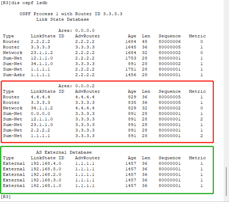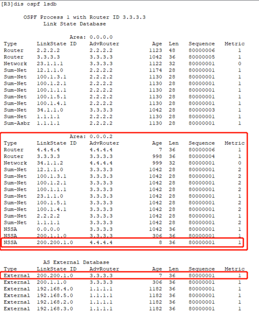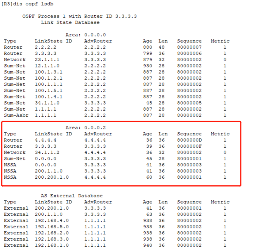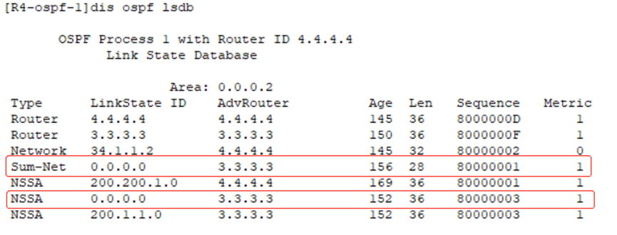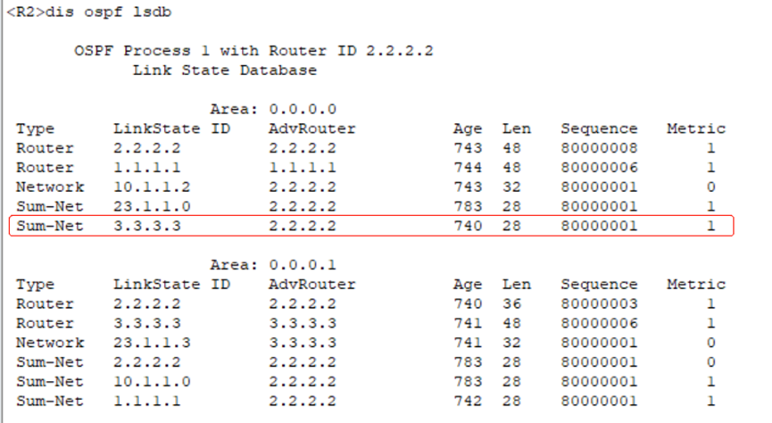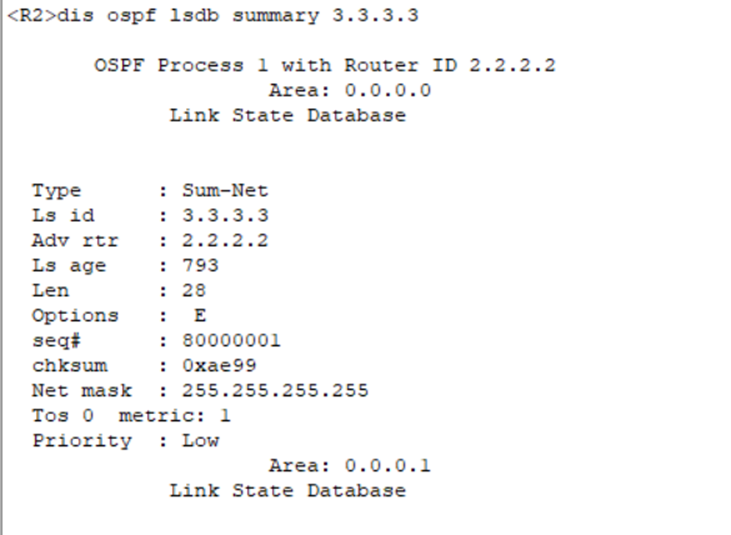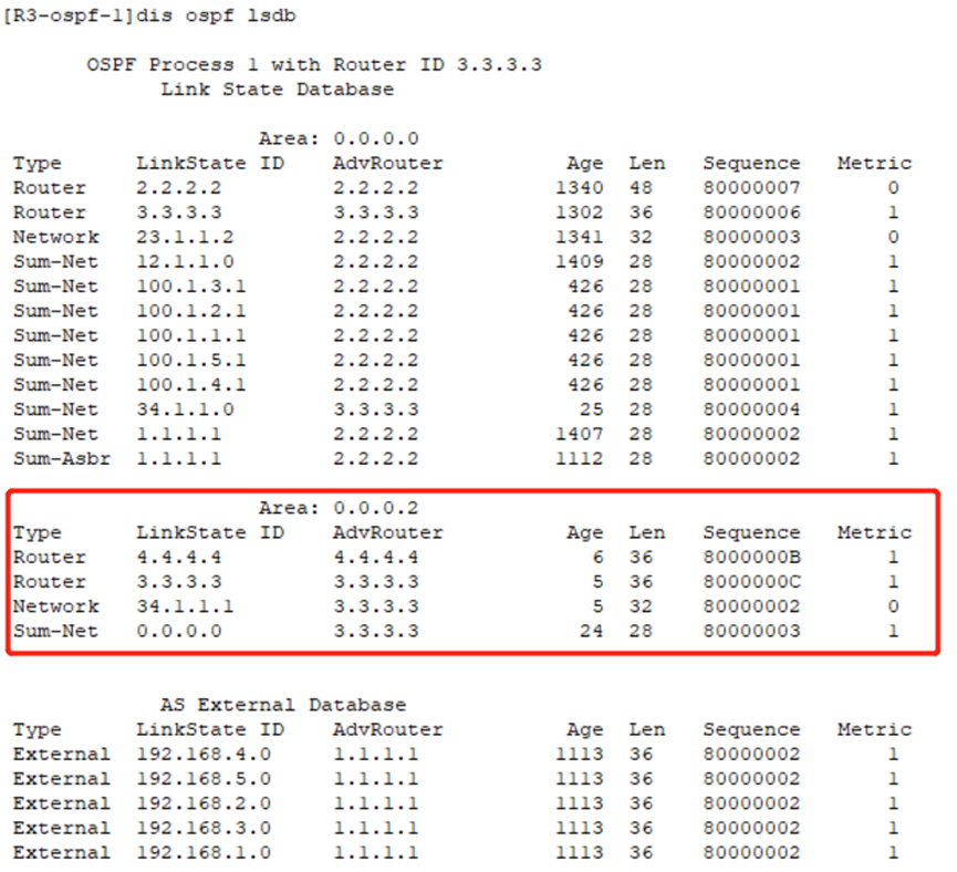 说明:第一个图由ABR(R2)转换成三类LSA泛洪至area 0区域中。第二个图在area 1区域中,有一条由Router-id为3.3.3.3产生的一类LSA。
