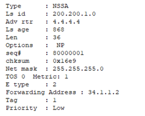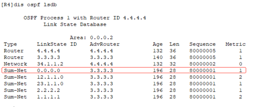 说明:对比末节区域,R3在完全末节区域中也不产生三类LSA,但做为该区域的ABR还是会为区域内的路由器R4生成一条三类缺省路由,用于访问外部网络。
