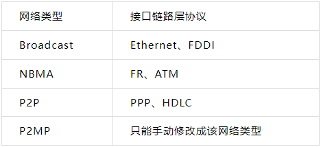 加入OSPF进程的接口都有相应网络类型,而网络类型缺省由该接口的链路层协议决定。