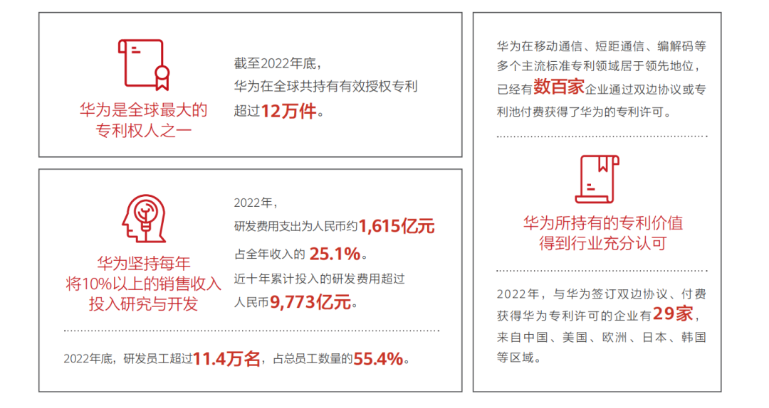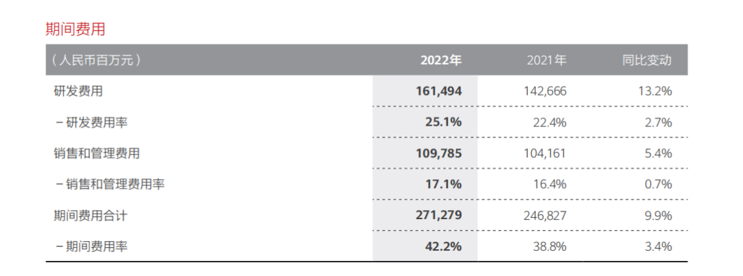 2022年,华为研发费用总额为1615亿人民币,研发费用占销售收入25.1%。