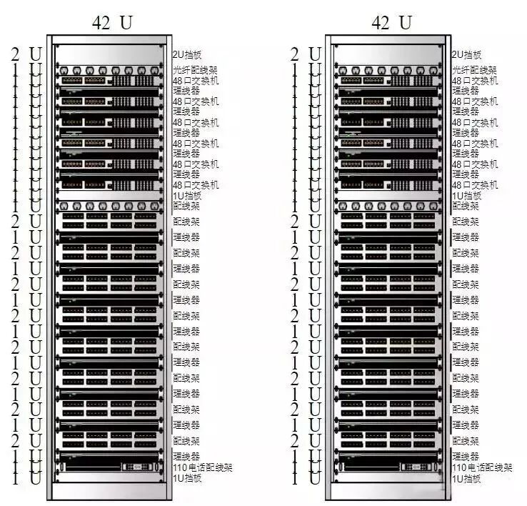 1、预留:每个设备间预留1U以便散热,预留交换机位置,考虑PDU位置。