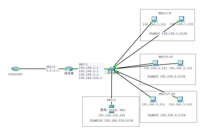 1841作为网关,提供路由、NAT、DHCP等服务,设置ACL限制VLAN间互访。