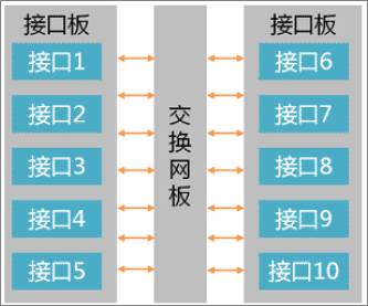 为了解决这种大量连接的问题,接口板和接口板之间需要通过交换网(Switch Fabric)板衔接起来,接口板只要通过若干连线跟交换网板连接,就能完成任意接口的互通。