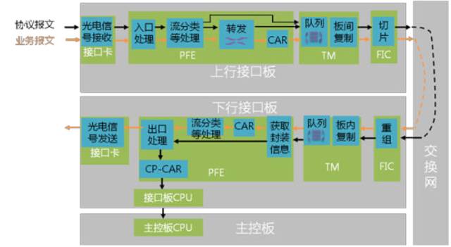 执行数据包转发的部件是位于接口板上的一个被称为包转发引擎PFE(Packet Forwarding Engine)部件,通常是NP或ASIC芯片。
