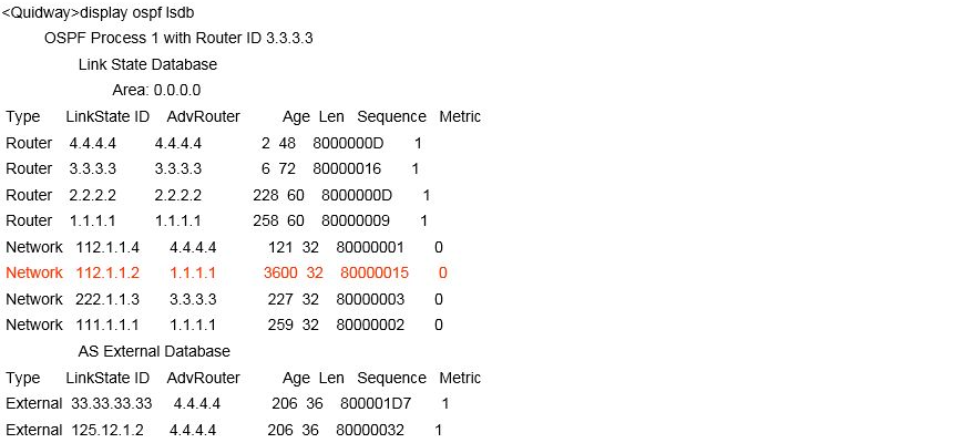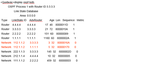 会发现存在两个LinkState Id为112.1.1.2的Network LSA,并且这两个LSA的Age字段一直都很小,Sequence字段增加比较快。