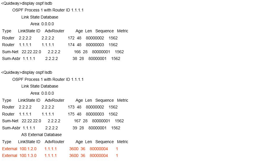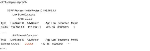 如果发现大量的AS External LSA频繁刷新,且都来自于某一台路由器,可以初步推测出不同区域的Router ID存在冲突。