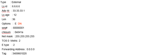 一、在MCE上输入display ospf lsdb ase<Link id>查看该LSA是否带DN-Bit: