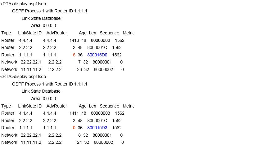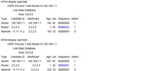 1、在任意一台路由器上每隔一秒输入display ospf lsdb,查看是否有Router LSA的Age字段频繁变化,同时查看Sequence字段是否增加的很快。