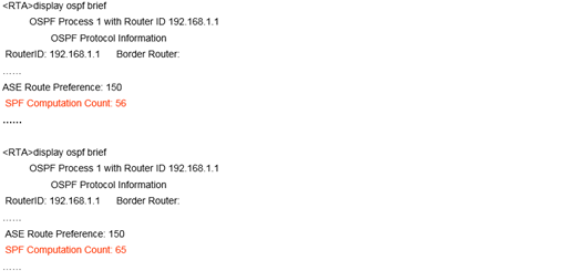 Router-B上一个接口2.2.2.2/24在OSPF中使能,并频繁up/down,在Router-A和Router-B上都会进行频繁路由计算,导致CPU高。