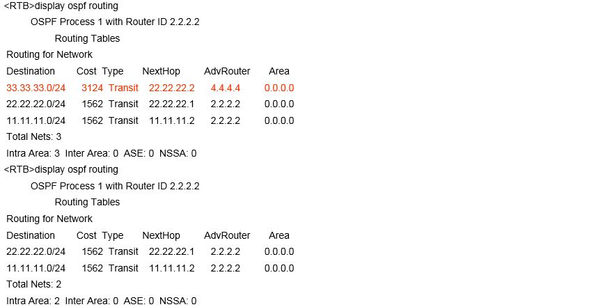 每隔一秒在RTB上输入display ospf routing,可以看到有路由在振荡,如果区域内路由频繁振荡,在没有邻居振荡的情况下,可以判断为RouterID冲突。