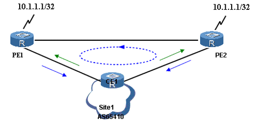 四、如上过程所描述的,到达目的地址10.1.1.1/32的路由,CE1-->PE1,PE2-->CE1,一个环路就产生了。