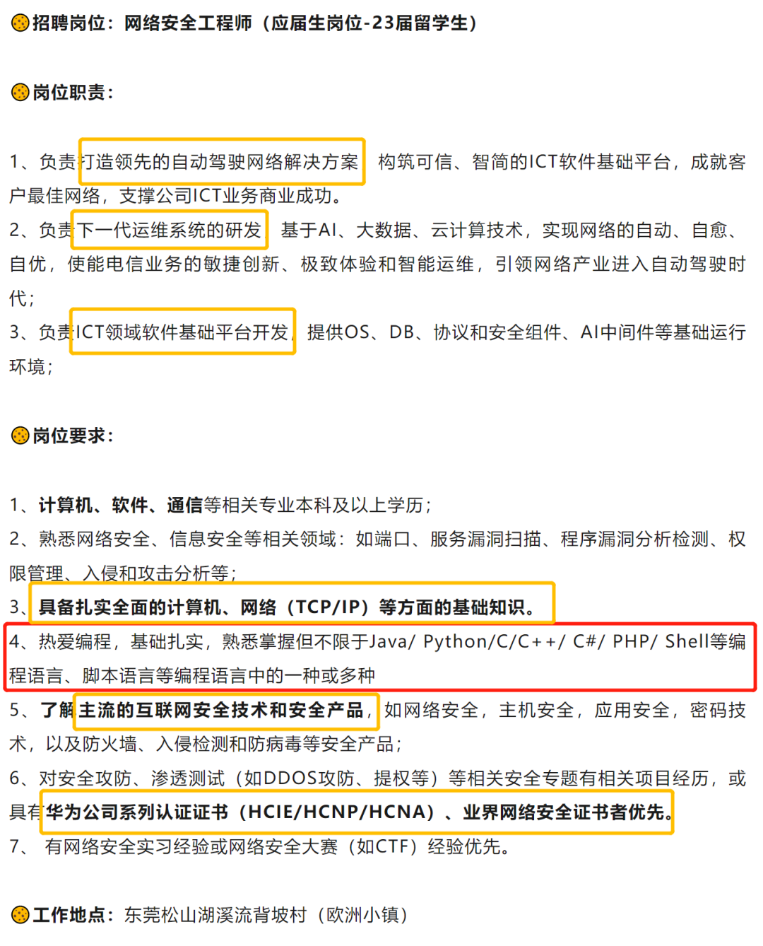 而岗位要求,你看看,和我上面说的一样,学历、网络技术、HCIE证书、编程,缺一不可。