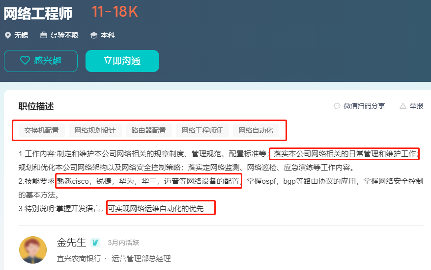 看这个岗位要求,就需要你具有一定的网络基础知识之外,还能够熟练编写python程序,实现各类网络自动化功能和数据分析需求。