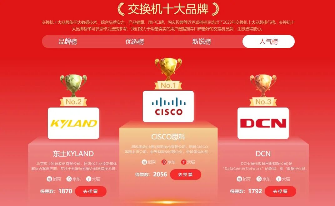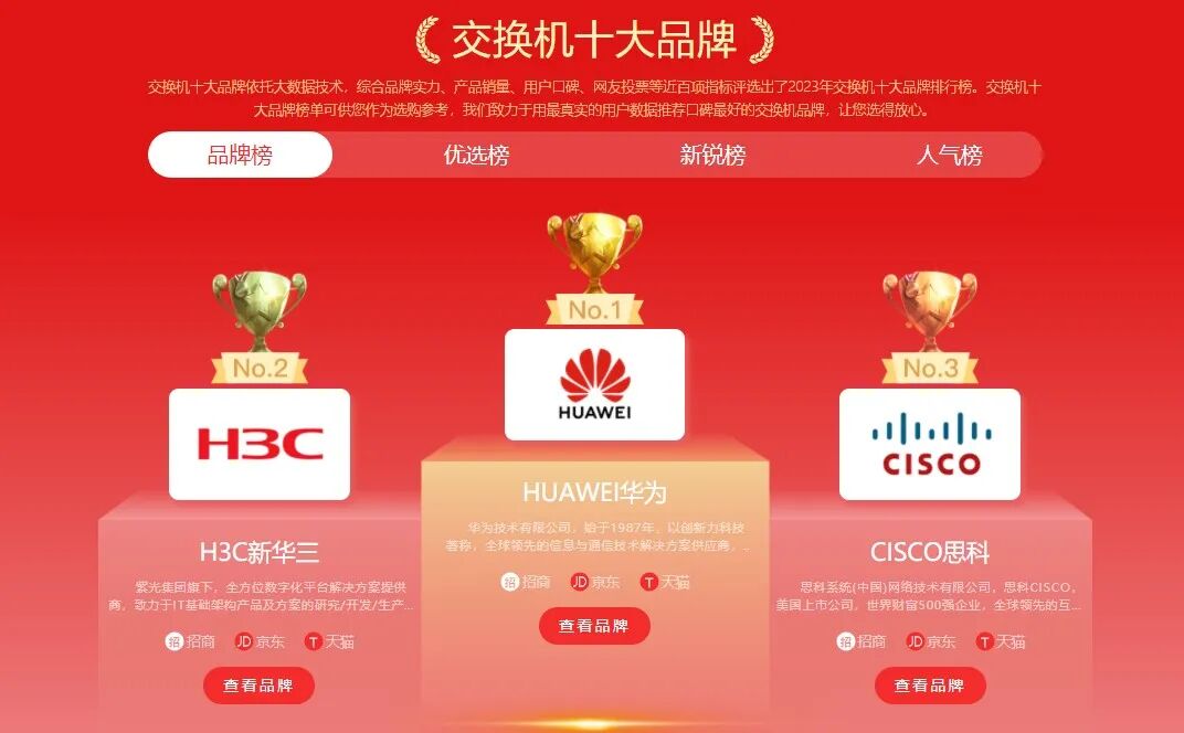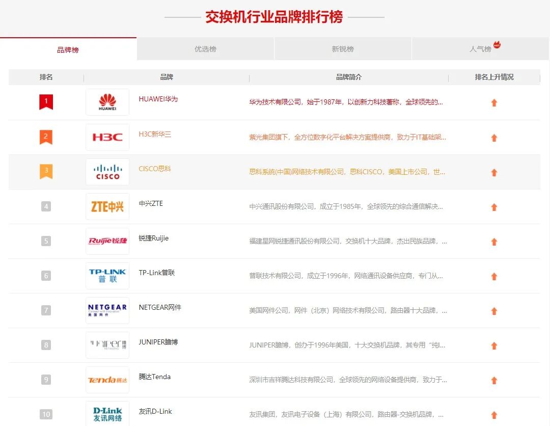 依托大数据技术,综合品牌实力、产品销量、用户口碑、网友投票等近百项指标,最终评选出了2023年交换机十大品牌排行榜。