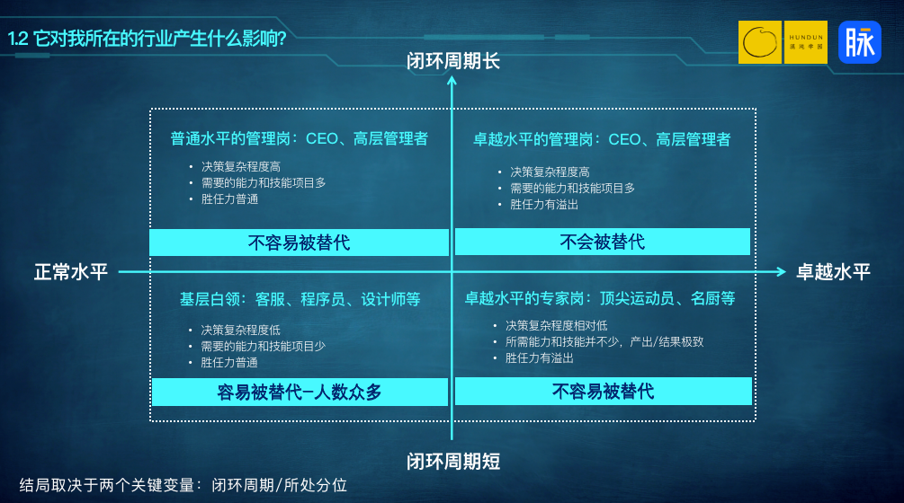 脉脉创始人兼CEO在混沌学园《AI崛起,职场变革与人的适配》课程中,从闭环周期长短和水平所处分位两个维度,将工作划分到四个象限。