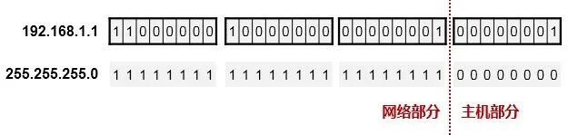 ● 网络掩码值为1的bit对应IP地址中的网络位;为0的bit对应IP地址中的主机位,以此来辅助我们识别一个IP地址中的网络与主机位,如下图: