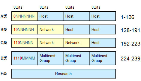 因此我们对IPv4地址空间进行类别上的划分,一共有五类: